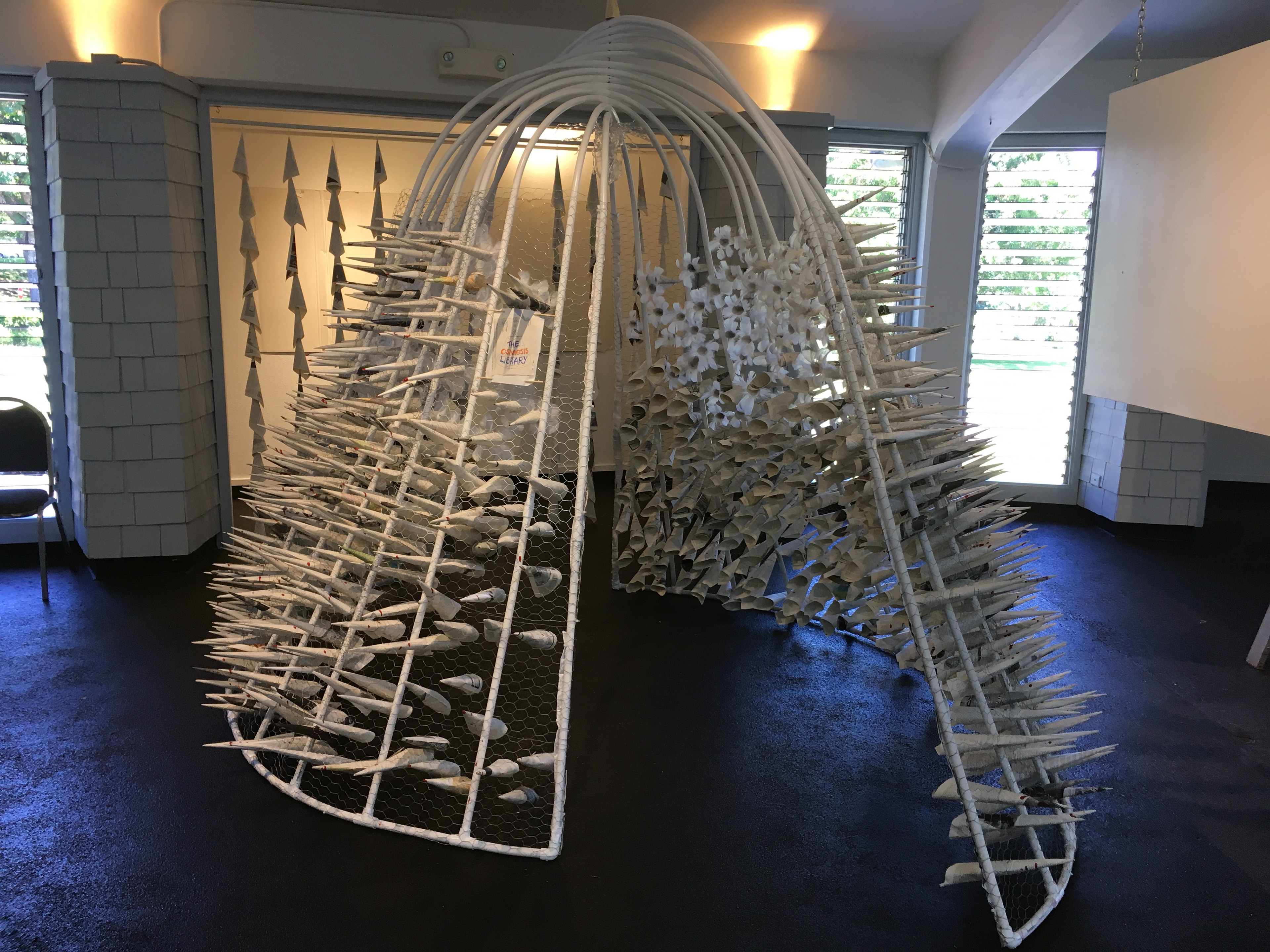 2019 - 10x10x10 Installation Art Show. 10 Artists 10 Spaces 10 Materials (My Artists Choice: Encyclopedia Pages) May 2019 Wailoa hosted its annual 10x10x10 Artists Challenge. Artists participating in this year’s challenge had one year to develop and construct an installation for one of the ten spaces in the Main Gallery. Artists were only able to use the defined nine materials plus their artist choice material and only four days to install their art in their assigned space. The only materials they were able to use were: wooden chopsticks, plastic clear water bottles, crayons, feathers, chicken wire, cardboard, white paint, PVC pipe, connectors/fasteners and their artist choice of a material which they have been asked to keep a secret until installation day (Encyclopedia Pages).